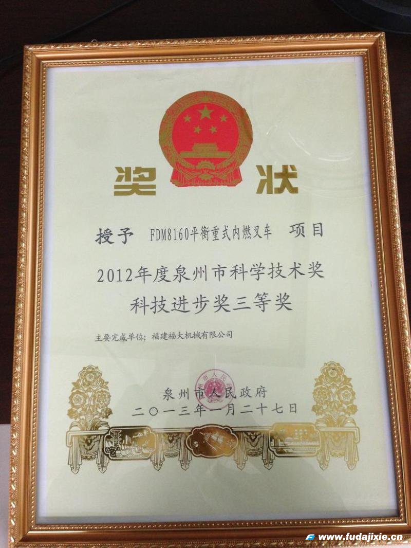 獲獎背后,是政府部門對我司科技創新引導和鼓勵的體現,更是我司科技綜合水平不斷進步和個人研發實力的展示。自創立以來,公司始終堅持“戰略,發展,創新,蛻變”的企業經營理念,大力推進企業自主創新,不斷提升企業知識產權創造和運用水平,公司科技創新工作取得豐碩成果,佳音頻傳,不僅產品以減少污染、節能高效的性能獲得客戶的一致好評,更為欣喜的是繼獲得“2011年度福建省優秀新產品獎二等獎--FDM8300平衡重式內燃叉車”榮譽之后,再獲泉州市人民政府授予的“2012年度泉州市科技進步三等獎”。科技獎捷報傳來,對我司促進科技創新和發明創造,激發企業和個人科研動力,促進產業和社會發展,乃至進一步在全社會營造尊重科學、致力創新的氛圍,都是最有力的褒獎,也是最給力的推動。